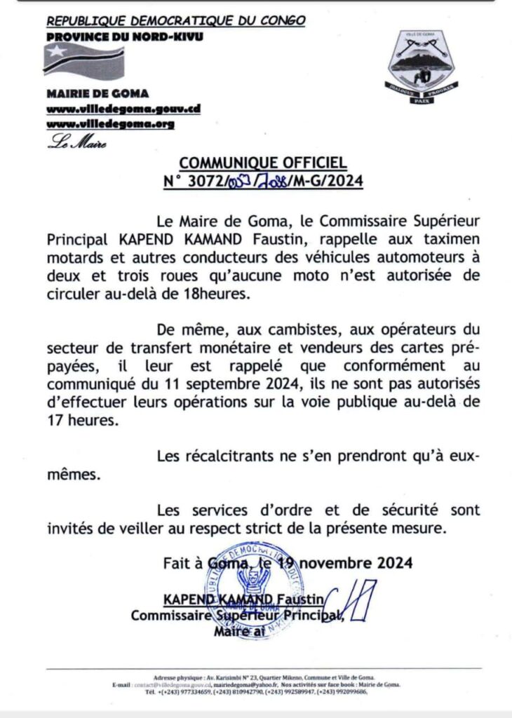 Le maire de Goma, le commissaire supérieur KAMAND KAPEND Faustin, a récemment réaffirmé les mesures restrictives concernant la circulation des motos et les activités commerciales dans la ville.