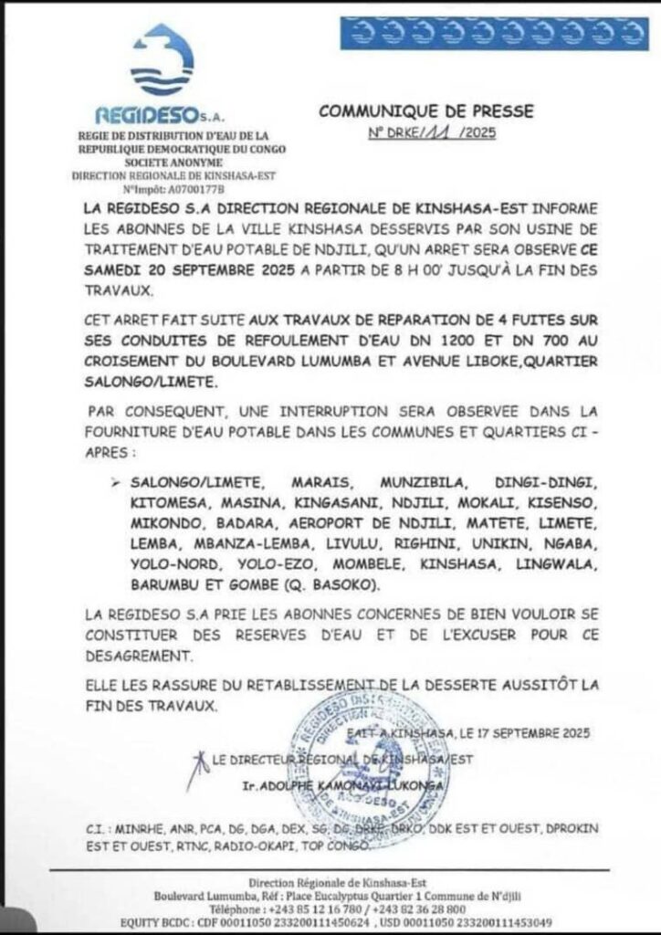 Les zones concernées par cette coupure incluent Salongo/Limete, Masina, Ndjili, Kisenso, Kingasani, Matete, Lemba, UNIKIN, Gombe (Q. Basoko) et plusieurs autres quartiers densément peuplés. La REGIDESO invite les habitants à constituer des réserves d’eau pour faire face à cette situation temporaire, tout en s’excusant pour les désagréments que cela pourrait causer.