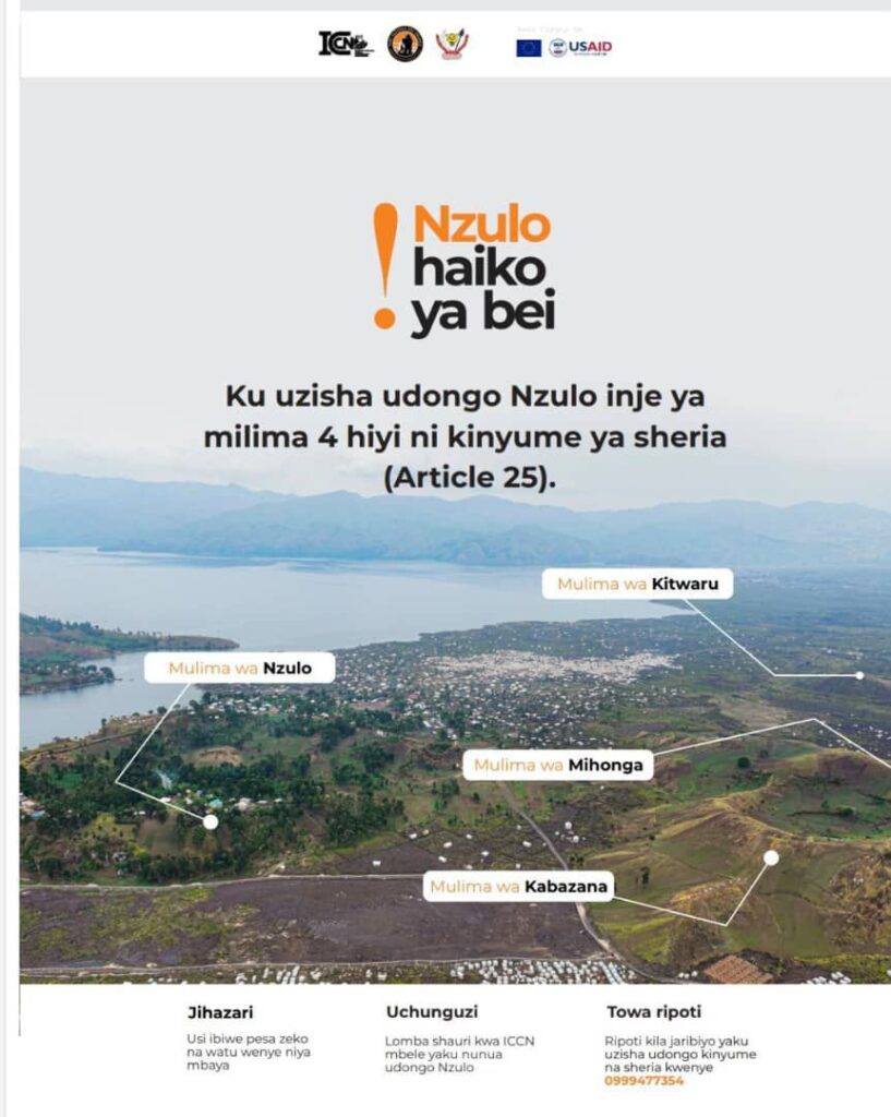 La campagne « Nzulo n’est pas à vendre » a été lancée par l’ICCN pour affirmer que la région doit être préservée pour des raisons écologiques. Des panneaux publicitaires et des messages diffusés dans les médias de Goma visent à mobiliser l’opinion publique en faveur de la conservation. Cette initiative a suscité des réactions mitigées parmi les habitants, qui se sentent souvent exclus des décisions concernant leurs terres.
