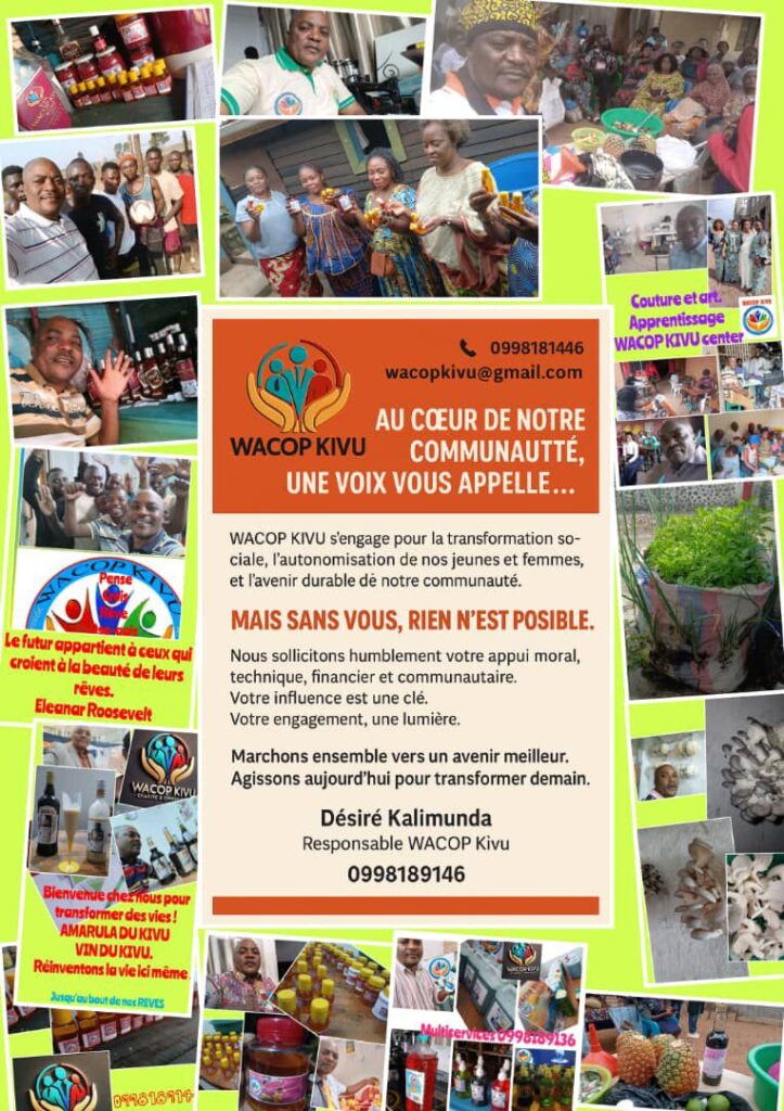 Inscrit dans une large vision d’une grande valeur de Penser, de Croire, de Rêver et d’Oser; Wacop kivu s’engage dans la transformation sociale, économique, l’autonomisation des jeunes et femmes, et l’avenir durable de la communauté, et la résilience socio-économique, affirme son PDG Désiré Kalimunda Kika.